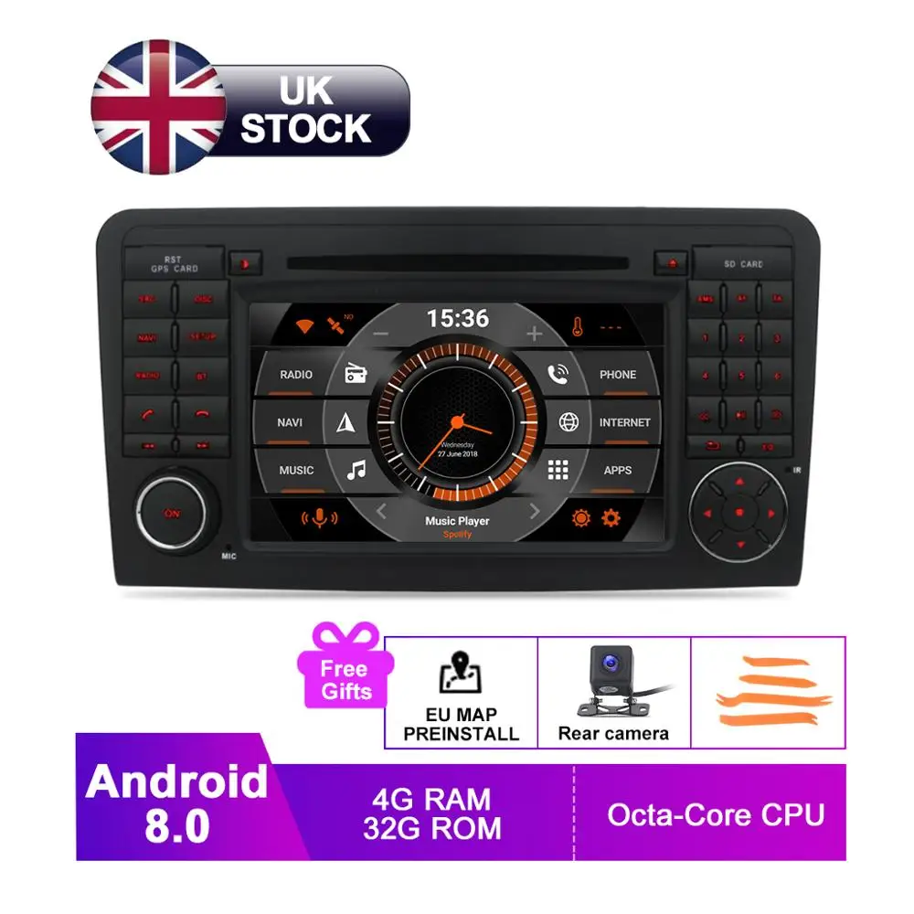 Android 8.0 Car DVD For Benz ML Class W164/ GL Class X164 Two Din 7" IPS Screen GPS 4GB RAM 32GB ROM Auto Radio Stereo RDS WiFi -- Free reverse camera + Free offline maps for iGo of Europe It is special 2 din radio station For Benz ML CLASS (W164) 2005-2012 (ML300, ML350, ML450, ML500) For Benz GL CLASS (X164) 2005-2012 (GL320, GL350, GL420, GL450, GL500) if your car has optic fiber amplifier or sound system, such as Bose or Harman-kardon, please note this item cannot support it Attention: Please make sure your original Car Stereo/Radio/DVD Player has the same shape as our unit Features/Specifications 1)Android 8.0 Oreo, RAM:4GB, ROM:32GB, CPU: Octa-core Processor 1.5GHz, High quality radio IC: NXP TEF6686, with better reception. 2)Built-in TDA7851amplifier IC, Supports subwoofer audio output, and control it separately. Screen Resolution: 1024*600, Support 4K(3840×2160 pixels)/1080P HD video,support mirror link function,You can use your smartphone's online GPS to mirror on this unit,support DAB+ function(optional) 3)Supports GPS Navigation, pre-install Google map(without offline map data),Support output almost everything to the headrests,even it play the video from USB/SD card,or online Youtube video. Built in USB Port/ Micro SD Slot(up to 32GB), WIFI(Built in WIFI modem)/4G internet(Extra device required), Support reversing camera(Extra device required) 4)Support Fast-boot. After the installation, this machine only need about 1 secondto finish booting from the 2nd time.(Other machines typically take 30 seconds) 5)Support Bluetooth call /audio play, Sync phonebook, quick search contacts, external microphone Specifications CPU: Octa-core CPU Processor 1.5GHz RAM: DDR3 4GB Nand Memory: 32GB Radio IC: NXP TEF6686 Bluetooth: BT 4.0 Amplifier IC: TDA7851 Working Voltage: 10.8~14.8V DC Audio output: 4*50W Max Boot time(2nd time): about 1s Screen Screen Size: 7-Inch IPS Screen Resolution: 1024x600 Capacitive Touch Screen (5 points) Operation System The newest Android 8.0 system, Octa-core CPU Processor 1.5GHz with RAM:4GB&ROM:32GB. more smooth and faster processing speed for running applications. EQ Built-in TDA7851 amplifier IC, Supports subwoofer audio output, and control it separately. Max audio output: 4X50W Phone Mirroring Mirror your phone on the 7inch screen. For Android phone, you can mirror and control on the unit via USB cable connection, Air Play For iPhone, you can just mirror on the unit via wifi connection, can not control GPS Support online and off-line navi app, support 3D Maps and voice guidance, your long journey will no longer be bothered by the nightmare of getting lost. Voice Guidance: Yes 3D Map: Yes (Support radio/Bluetooth/USB/SD playback while navigating.) AV Output For this unit, it can output almost everything to your headrests, even you play the video from USB/SD /online Youtube video. Many headunits in the market can only output the DVD video to the headrest. Bluetooth 4.0 Built-In Microphone in the control panel for hands free calling function External microphone also included for free clear voice calling Support Bluetooth audio player/Phone Book function, quick search contacts. (Attention: This function can only be realized when the mobile phone supports Bluetooth Audio Output/Contacts Output) Support Bluetooth Connection for iPhone/ Most Android Phones/ Even some None Smart Phone (Attention: The Bluetooth just for audio stream transfer, it doesn’t support file transfer or Internet tethering.) Radio High quality radio IC: NXP TEF6686,with good radio reception. AM/FM tuner built in (worldwide) AM frequency range: 522-1620 (Europe), 530-1710 (America), 522-1620 (Russia) FM frequency range: 87.5-108 (Europe), 87.5-107.9 (America), 65.0-108.0 (Russia) RDS Radio: Yes WIFI/3G internet 3G: Require external USB 3G modemand your local Internet SIM card to be connected,Only support WCDMA3G bandwidth WIFI: Built in WIFI modem Direct turn on WIFI function to search and connect to any free WIFI hotspots USB/SD Built in micro SD card slot/ USB Port. Support SD card/ USB drive up to 64GB. Support Audio Formats: MP3/WMA/WAV/APE/FLAC/OGG/AC3, etc. Support Video Formats: RMVB/AVI/MPG/MPEG/VOB/MOV/ASF/FLV/3GP/MP4, etc. Steering Wheel Control Change the track, volume, etc, without taking your hands off the steering wheel, which makes your driving much safer. DVD Support all formats DVD drive: Region Free Compatible Formats: AVI/DVD/DVD+R/DVD-R/DVD+RW/DVD-RW/VCD/MP3/CD/CD-RW/JPEG etc. AboutShipment CustomerFrom Spain And Portugal,Please Note: IF you have the same zip code like this: