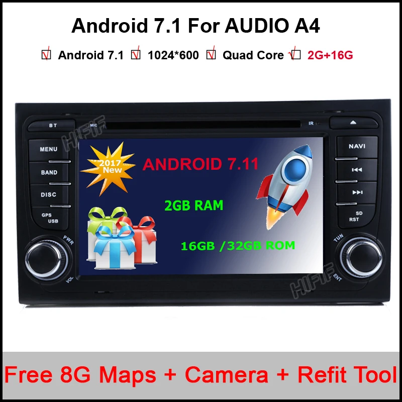 Free Camera 1024*600 Quad Core Android 7.1.1 Car DVD Player for Audi A4 2002-2007 S4 RS4 8E 8F B9 B7 RNS-E (DTV DAB+ Optional) 2GB RAM + 16GB ROM FAQ: 1.Is there any Gift if i order this product? Yes! Free Shipping(DHL/UPS) + Rear view Camera(Universal) + 8G Maps (Lastest) 2.Where is the Gift? Camera will put into the Radio color box, and the 8G maps put into the radio GPS Card Solt, please check it when you receive the products 3.How long can receive this products? We ship only by DHL/UPS, it will take about 3-5days arrive your home.(Russia ship by SPSR,it will take about 5-15days) 4.Is there any optional function can i choose it ? 5.Is this can fit for my Car ? For Audi A42002-2008 For Seat EXEO 2009-2012 For Audi RS4 8E 8F B9 B7 RNS-E 6.Key Function Car DVD Player(Pure Android 7.1 OS)+ Build-inGPS Navigation+ Stereo Radio withRDS+ SupportDVR(Optional) +Bluetooth + USB + SD + AUX +HD 1024*600 +DTV(Optional) + 7InchCapacitiveTouch Screen + Steering Wheel control +build-in WIFI + OBDII(optional) + 3G(Optional) + DAB (Optional) 7.Does it have my country language? Chinese Simplified;Chinese Traditional;English;Russian;Turkish;French;German;Italian;Spanish;Portuguese;Hebrew;Arabic; polish; Thai language; Persian; Hungarian; Uygur language, Japanese, Korean, Dutch, Norwegian; Finnish; Bulgarian; Czech, Danish, Greek; Romanian; Slovak; Albanian English;Russian;German;Italian;Japanese;Arabic;Chinese Simplified;Chinese Traditional.Indonesian